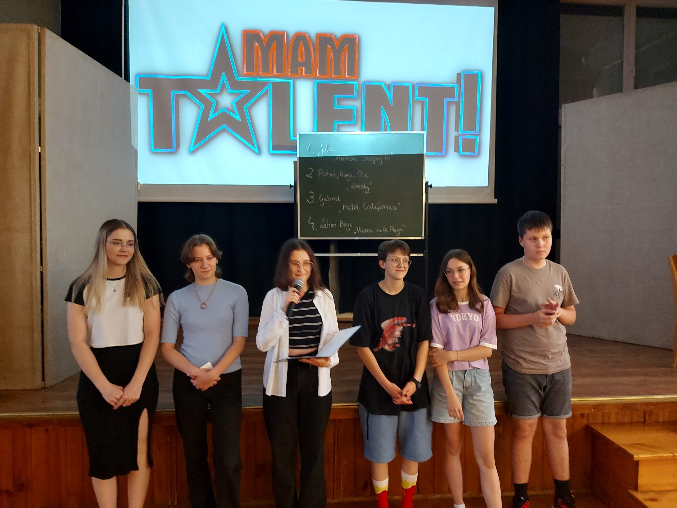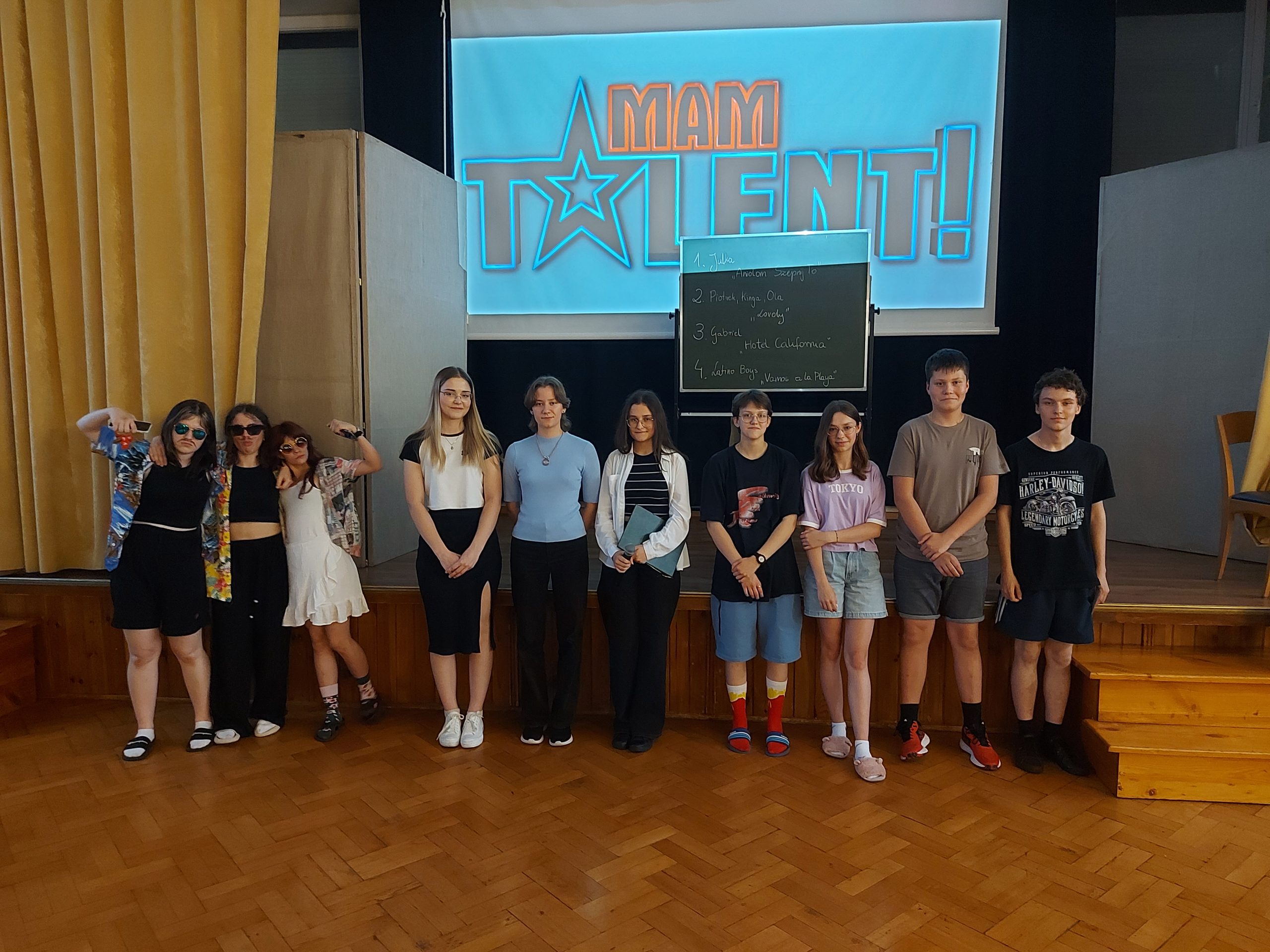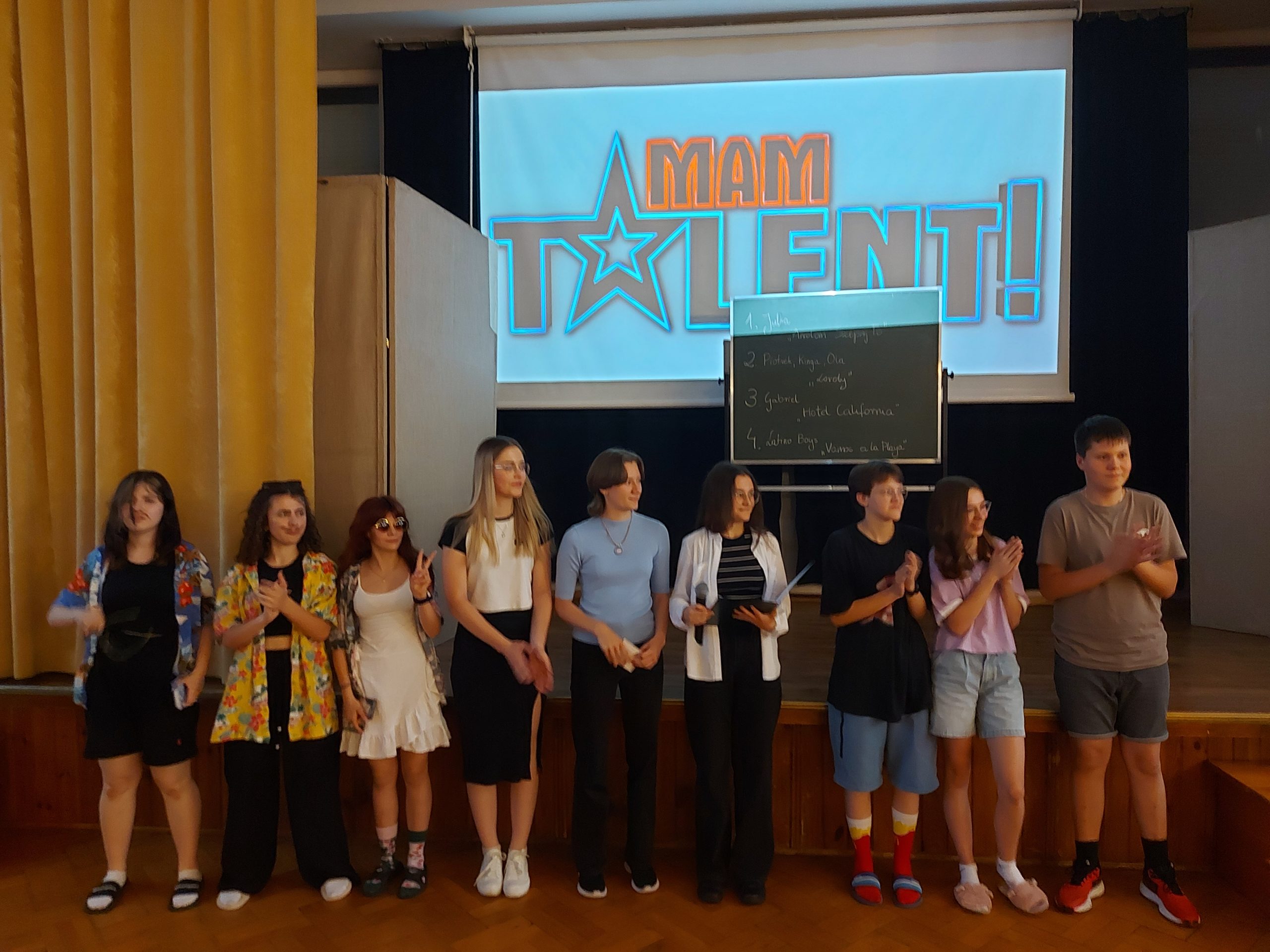 Młodzież w Internacie świętowała Dzień Dziecka. Z tej okazji 4 czerwca odbyła się kolejna edycja internackiego „Mam Talent” zorganizowana przez wychowanki z klasy III Alę i Magdę przy wsparciu wychowawczyń p. A. Sagan i p. E. Krawczyk. Przed jury i licznie zebraną publicznością swoje talenty zaprezentowali Julka, Ola S., Tosia, Olga, Gabryś, Piotrek, Kinga, Ola M. Niekwestionowanym zwycięzcą okazał się Gabryś, który wykonał utwór „Hotel California”. Gratulujemy! Uczestnikom konkursu p. kierownik M. Jóźwina-Myka, nie tylko ufundowała, ale też osobiście przygotowała pyszny deser lodowy. Zgromadzona na internackiej imprezie młodzież została też poczęstowana owocowymi cukierkami ufundowanymi przez wychowawców.