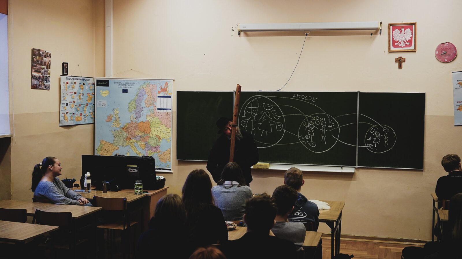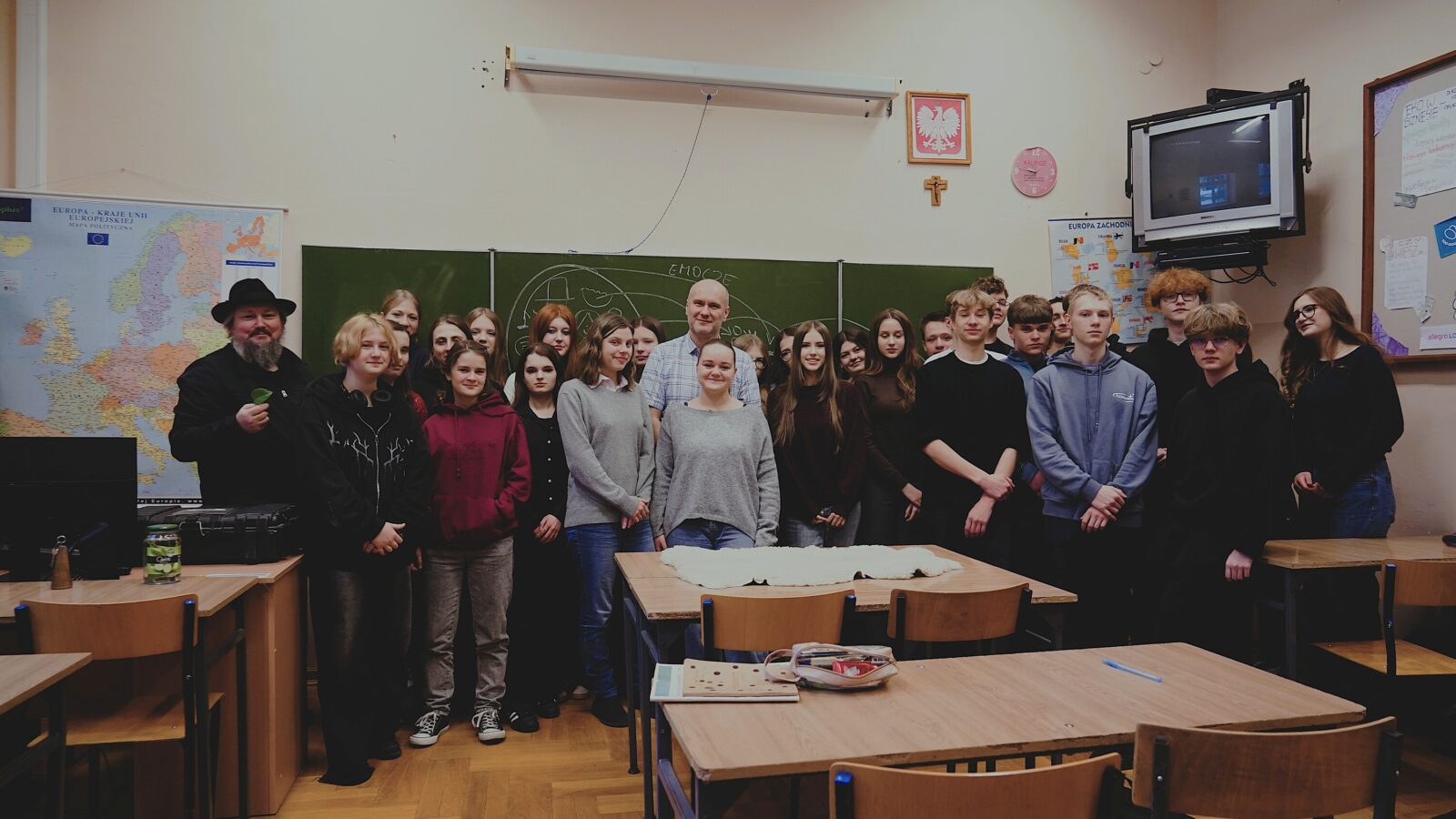 Klasa 2C uczestniczyła w warsztatach prowadzonych przez Joszko Brodę. Uczniowie zastanawiali nad odpowiedzią na pytanie „Kim jestem?” w kontekście kultury przodków, ale też zobaczyli na żywo i usłyszeli, jakie dźwięki można wydobyć z różnych instrumentów i przedmiotów dookoła nas: rogu antylopy, długiego drewnianego fletu, kamienia z dziurami, a nawet na liścia z kwiatka doniczkowego.